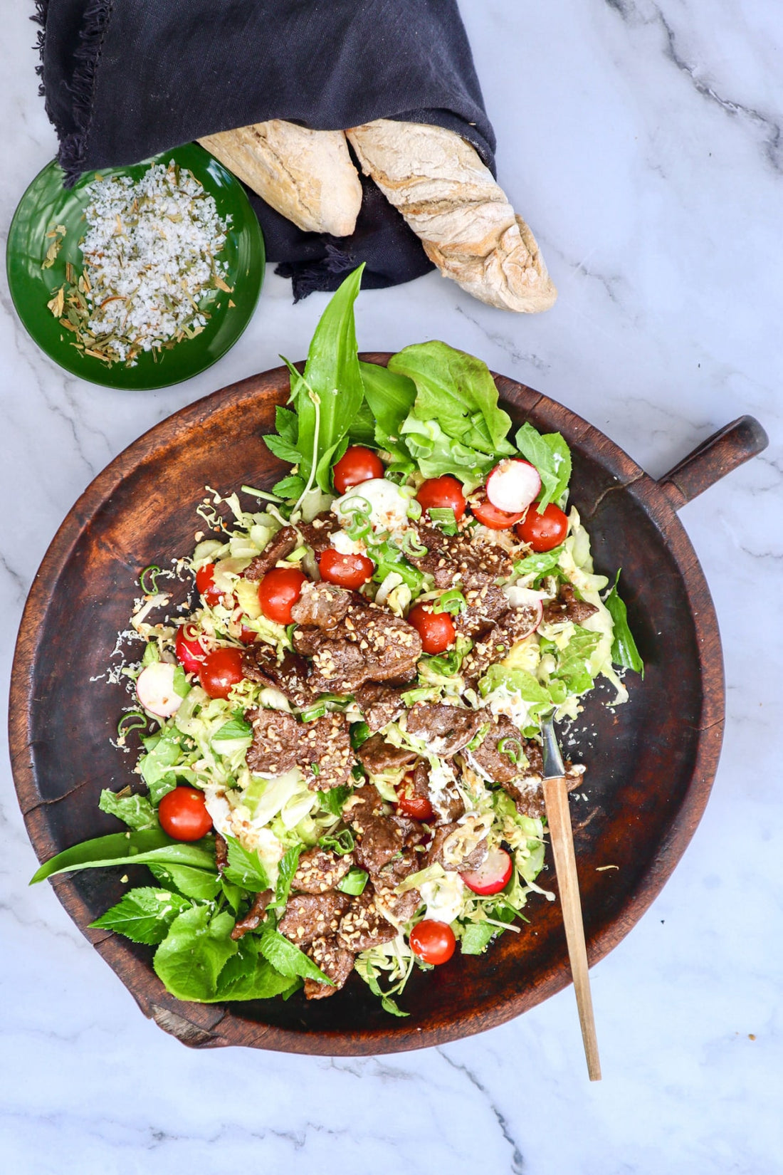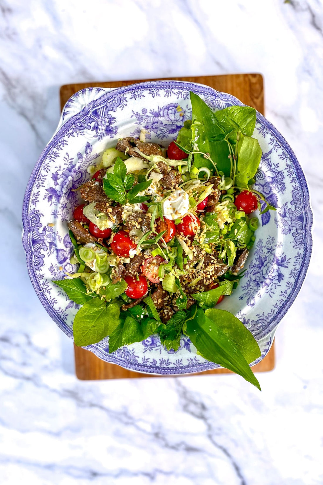 Som en somrig biffsallad med svenska smaker. Citronmarinaden gör att köttet mört, gott och ger en god citrussmak.